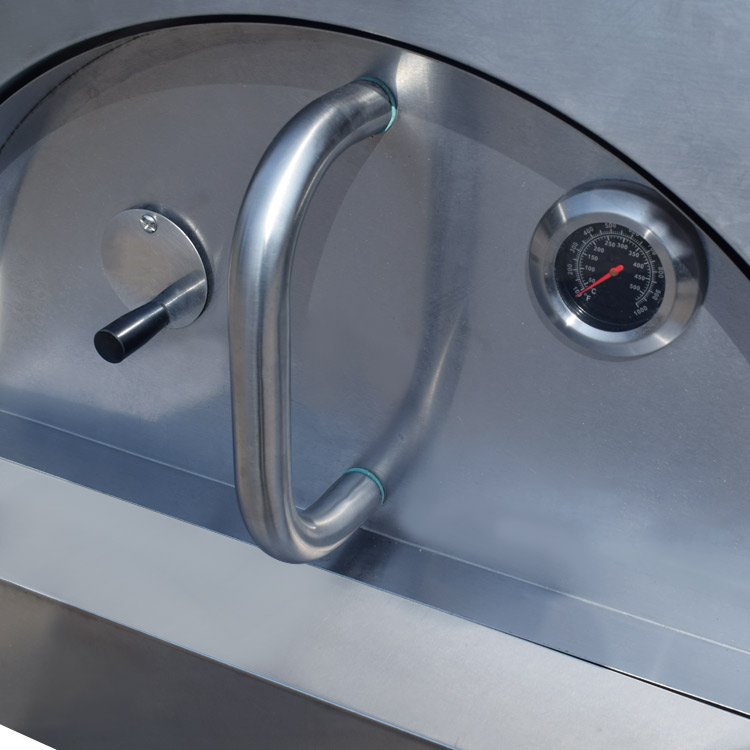 Popular Outdoor Hot Sale Stainless Steel Wood Fired Pizza Oven 1. Rear firebox design. 2. There is a layer of push-pull type pizza stones in the oven. 3. The front cooking room is interlinked with the rear charcoal firebox in the oven. 4. The aggregation temperature of 500℃ in the oven. 5. Installing an adjustable vent on the top. 6. The side and rear of the oven are protected by a high-density connector, 80mm - 100mm insulation layer. 7. The front cooking room with removing style oven door. 8. The side firebox with hanging style oven door. 9. Installing a tool shelf to hang tools outside.