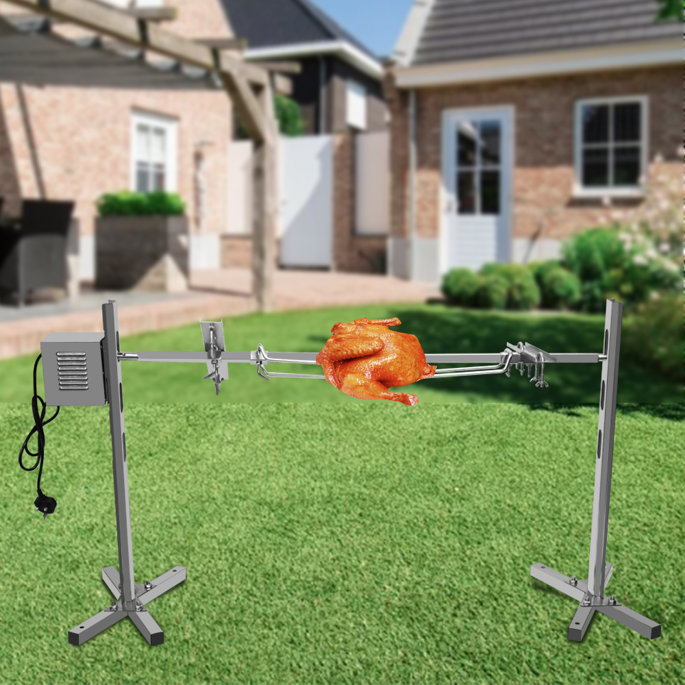 All made of high-quality stainless steel material, equipped with a motor, a long meat skewer made of 304 stainless steel, two leg fixed forks, and two adjustable forks
