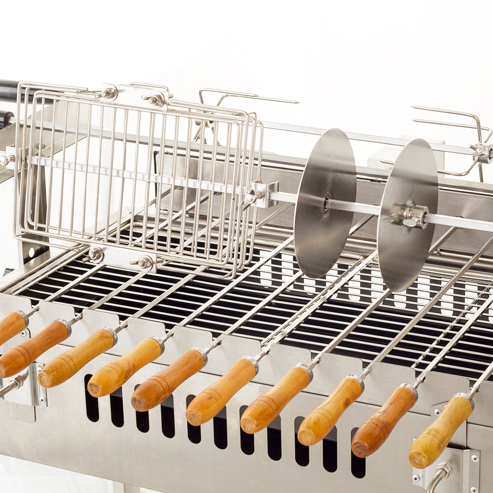 The Charcoal cyprus bbq grill can meet all the needs of Cyprus / Brazil barbecue lovers. We have designed a stainless steel cover to ensure the temperature of the food. Below, there are also 11 skewers made of stainless steel that are also rotated by the same type of gearbox with an electric motor that is powered by a DC power supply and whose speed is adjustable. Speed control ensures you are in control.