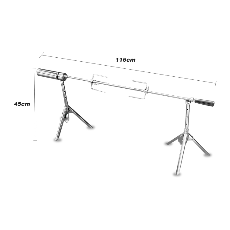 Each case contains a Skewer Disassembled into three parts, a handle containing the motor and a two-cell battery holder, two roasting spit forks, two Adjustable tripods, assembly instructions and a safety manual.